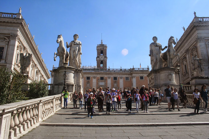 Nach einem kleinen Käffchen zur Stärkung und zu Füßen des Kolosseums ging es über die (leider teilweise eingepackten) Kaiserforen weiter zum Kapitol. Vorbei am Reiterstandbild des Philosophenkaisers Marc Anton zogen wir an den Dioskuren vorbei hinab die wunderbare Treppe von Michelangelo, um gleich wieder aufzusteigen zur Kirche Santa Maria in Aracoeli. Interessant bei dieser Kirche, die an der Stelle des alten Junotempel steht, ist, dass die vorletzte Säule hinten links, durchbohrt ist. Manche sagen, dass dieses Loch noch aus dieser Zeit stammt als hier Auguren die Auspizien hielten und dass diese Säule auch dazu diente, einen durch das Loch definierten Himmelsbezirk abzugrenzen und zu beobachten. Wieder draußen sahen wir uns nochmal den Platz rund um die Schreibmaschine an und genossen die herrlichen Ausblicke hier. Den neu gebauten Fahrstuhl nutzen wir nicht.